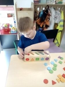 We have been developing our fine motor skills posting shapes into the shape sorters, matching activities and large drawing with chalk in the outdoor area