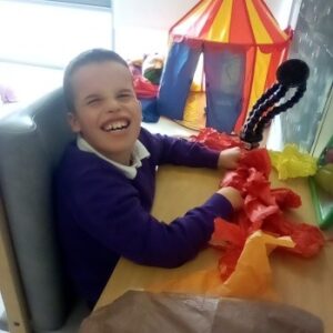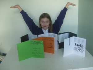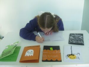 Working on her therapy target of developing her handwriting, Rosie has made Halloween cards for her peers in her class, and I think you’ll agree that they look brilliant! Getting students involved in tasks that involve even a small bit of writing is excellent practice, not only of handwriting but of all of the many other skills that go into being a writer too. Shopping lists (with some of their favourite things to buy) or greeting cards are a fab way to do a little bit in a motivating way – and even better when they look as great as Rosie’s!