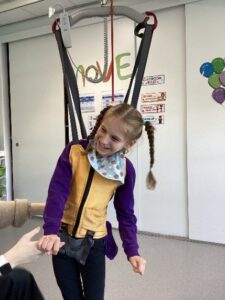 In hydro, she has worked hard on cycling her legs and actively pushing off the pool wall or a staff member’s hand to develop her leg strength further!