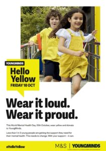 Let’s show our support and stand together for young people’s mental health – and don’t forget to stop by the Wellbeing room for a “Hello Yellow” sticker!