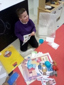 We focused at lot on our interests this week. Amiee enjoyed gloop, adding different material to make different textures. Hey Duggie and friends joined us. George identified all of the characters and their features. Peppa and her family joined the class, and Hayden moved the characters around on the different scenes, they visited the beach and the school. We had lots of mini-beasts activities this week: Rowan matched the heads to their bodies then matched the plastic mini-beasts to their pictures correctly naming them all.