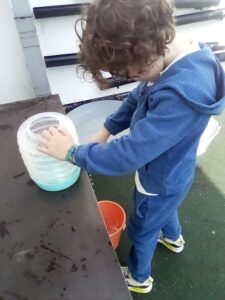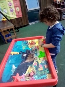 We have enjoyed playing outdoor this week in the sand, with our new exploration tray and the water wall – lots of great filling, emptying and getting wet.