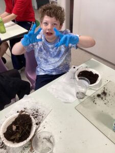 During a STEM session making Bug Homes, Isaac was touching mud and leaves which he found difficult but with encouragement and some gloves he did a great job